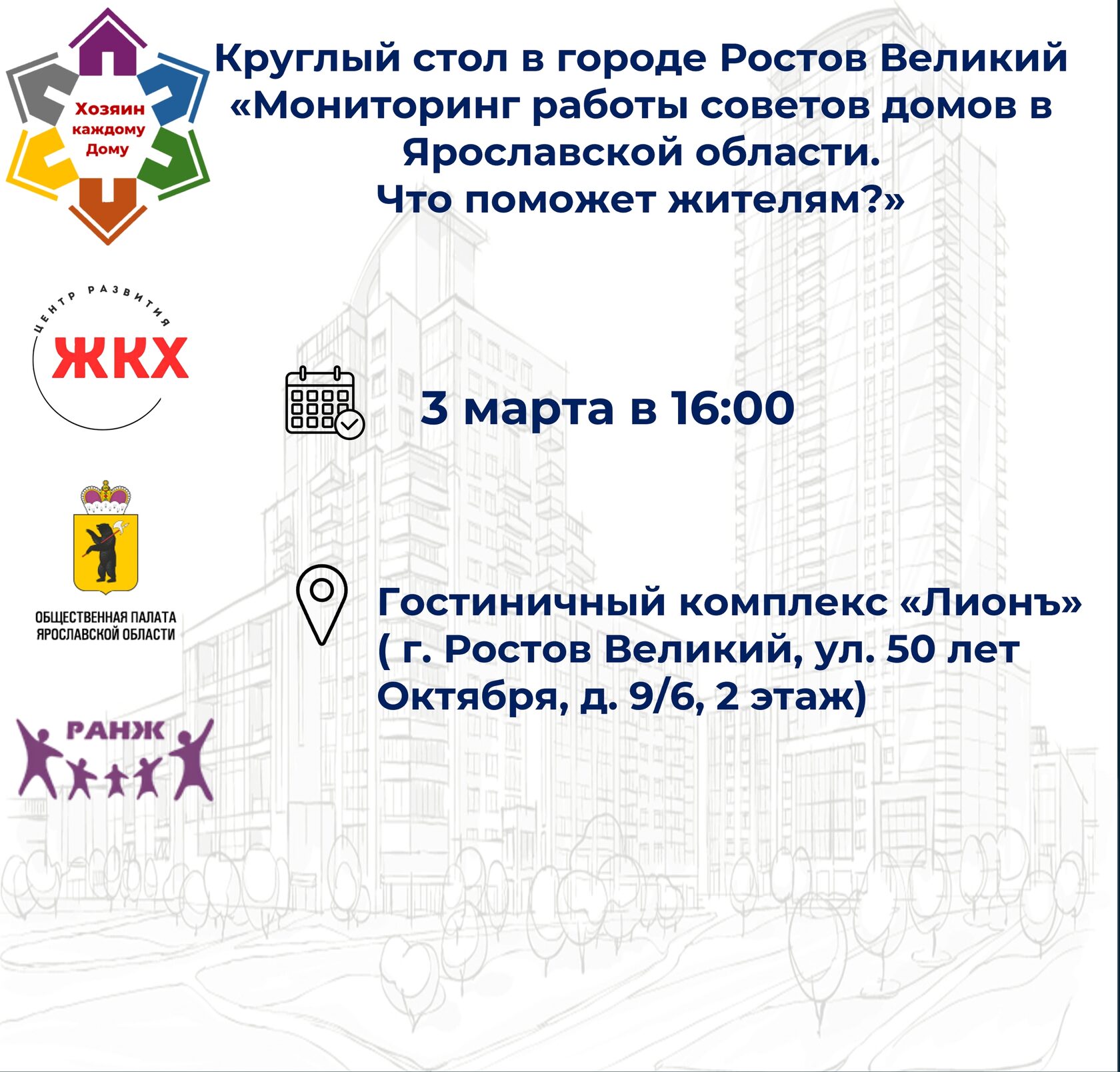 📆 3 марта 2026 года для жителей города Ростов Великий состоится круглый стол «Мониторинг работы советов домов в Ярославской области. Что поможет жителям?»